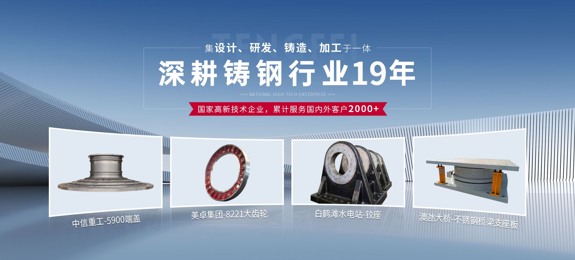 騰飛鑄鋼成立于2006年,位于全國鑄造基地河南省新鄉市,擁有員工300余人,是一家從事150噸以下碳鋼、低合金鋼、不銹鋼鑄鋼件研發、制造、服務為一體的國家高新技術企業?! 」就ㄟ^了ISO9001國際質量管理體系認證,擁有2項發明專 利,2項河南省科技成果、25項實用新型技術,通過了“環保績效評級B級企業”驗收,先后榮獲“河南省鑄造行業綠色發展企業”、 “河南省科技型中小企業”、“河南省專精特新中小企業”等榮譽稱號。  公司擁有2臺25噸電爐,4臺大型天燃氣熱處理爐、10米回旋自動拋丸機一臺, φ8m數控立車、φ10m數控滾齒機等各類高精裝備100余臺套,年產能3萬余噸,能為客戶提供從產品設計、木模加工、大型鑄造、大型加工一站式服務,產品廣泛應用于建材、冶金、鍛壓、冶金、水工、路橋、化工等多個重型行業。  長期服務于中信重工、中船重工、美卓、上海中交、萊歇、寶武、濟南重工等全球知名企業,在行業內擁有較高的市場知名度和美譽度。
